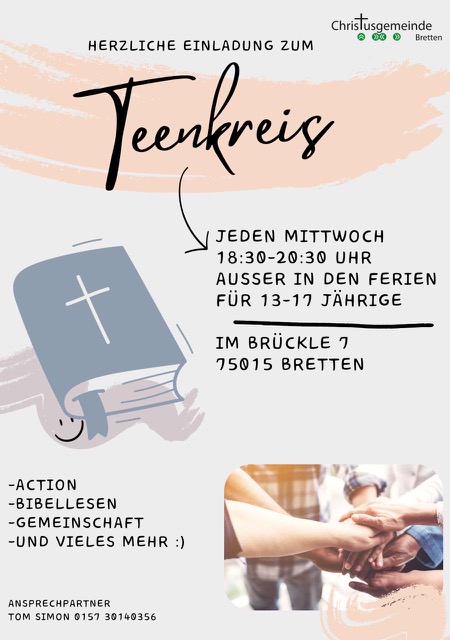 Wir Teens (13 - 17 Jahre) treffen uns immer mittwochs (außer in den Ferien) von 18.30 – 20.30 Uhr im Gemeindehaus.